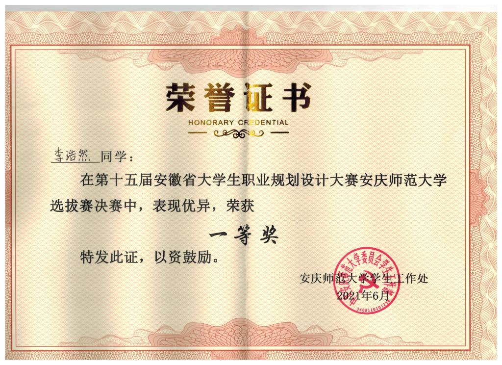 6月24日,第十五届安徽省大学生职业规划设计大赛校级选拔赛决赛在行政楼二楼会议厅举行。tyc41183太阳成集团李浩然代表学院参赛并获得校赛一等奖。