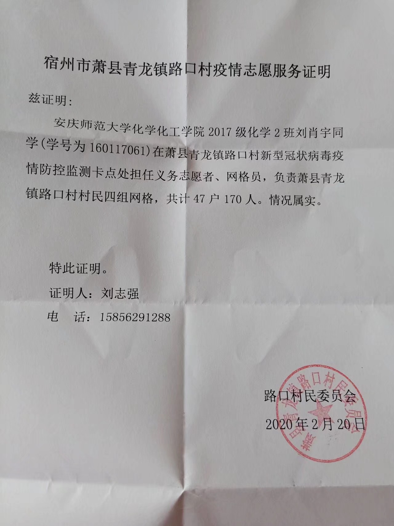 刘肖宇,女,共青团员,2019级化学2班学生。刘肖宇同学疫情期间积极参与安徽省宿州市萧县青龙镇的联防联控志愿服务。从大年初三开始跟随在村委会的父母挨家挨户向村民普及疫情防控知识,劝说村民们居家防疫。主动在当地镇设卡点处测量往来人员体温,登记出入人员个人信息,限制非本地区人员车辆通行,在卡点处喷洒酒精消毒等工作。