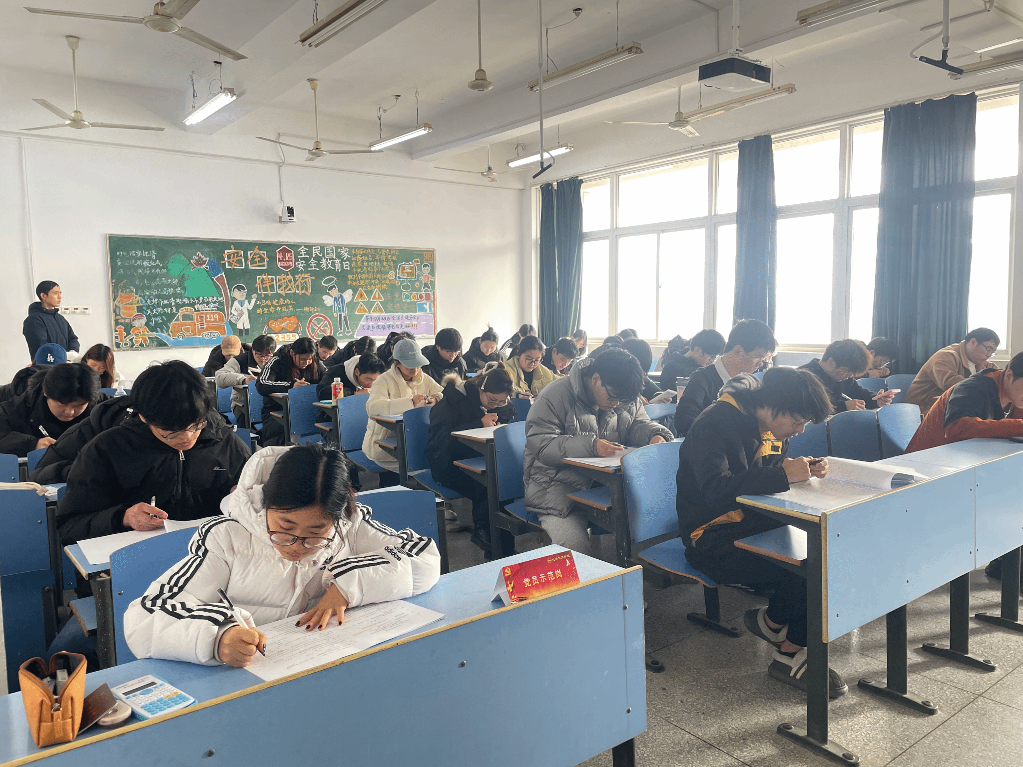 “请佩戴党员徽章、放置‘党员示范岗’席卡,主动接受师生监督!”考试期间,tyc41183太阳成集团的考场内,学生党员的身影格外醒目。按照活动安排,全体党员在每场考试中均严格落实“亮身份·守诚信”要求,将印有“党员示范岗”字样的红色席卡摆放于桌面左上角,佩戴党员徽章有序进入考场,以实际行动践行党员的责任与担当。考场上,党员们自觉遵守考场秩序,为广大同学树立了良好榜样。“看到党员同学胸前的党员徽章和桌上的‘党员示范岗’席卡,我更深刻地意识到,诚信考试不仅是对自己负责,也是对他人的公平负责。”此次“亮身份”行动,既强化了学生党员的党性意识,也为考场注入了“正能量”,带动更多同学自觉维护公平公正的考试环境,真正实现了“树道德之新风,立诚信之根基”的活动目标。