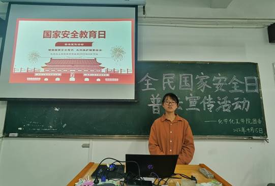 全民国家安全教育日是为了增强全民国家安全意识,维护国家安全而设立的节日,今年安全教育日的主题是“树立总体国家安全观,感悟新时代国家安全成就,为迎接党的二十大胜利召开营造良好氛围。”本次活动由化学专业2021(3)班的刘婷婷担任宣讲人,分别从国家安全的定义、维护国家安全、维护国家安全的义务、如何维护国家安全四个方面展开宣讲。