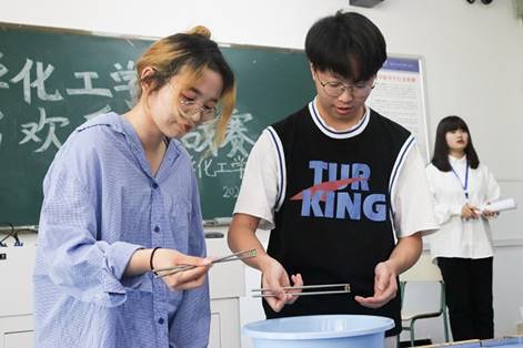 整场比赛共分为“争分夺秒”、“一气呵成”、“你比我猜”和“化学知识抢答”四个环节,每个环节由两组队员或一人一组参与比赛。拿起筷子、紧紧盯着玻璃珠、下筷、夹起……整个过程一气呵成,“争分夺秒”环节中,选手们将玻璃珠夹在筷子上,小心翼翼地挪着步子,防止玻璃珠掉落;比赛进行到“一气呵成”环节时,选手们又鼓起圆滚滚的腮帮,弯着腰聚精会神地吹着漂浮在装满水的杯子上的乒乓球,每个人的脸庞都涨得通红,逗得观众们捧腹大笑……