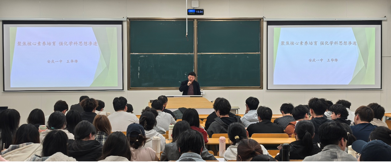 4月8日,学院在教学楼C208举行2024级化学师范生教育见习系列讲座,安庆一中高级教师王华锋、潘丹丹作专题报告。学院院长王钧伟教授主持报告会,化学专业部分教师、2024级化学专业全体学生参加报告会。